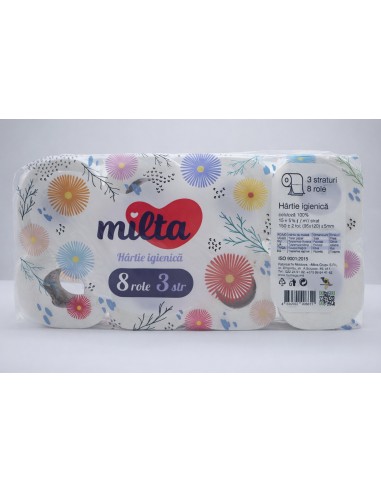 Hârtie igienică Milta cu 3 straturi, 8 role/pachet, celuloză, albă