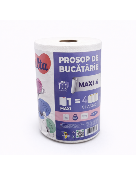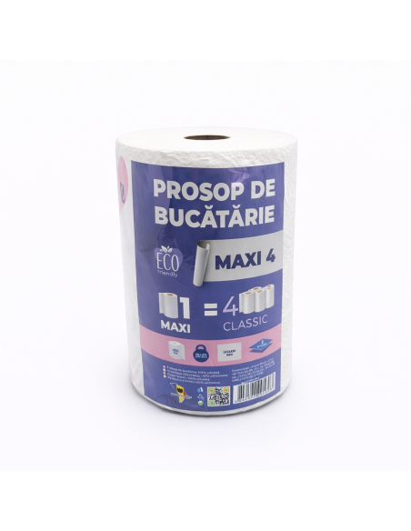 Prosop hârtie Maxi-4, cu o lungime de 50 de metri, reprezintă o soluție convenabilă pentru utilizarea zilnică. Aceste prosoape absorbante sunt ideale pentru bucătărie și treburile casnice. Formatul compact al rolei permite depozitarea ușoară și utilizarea practică.