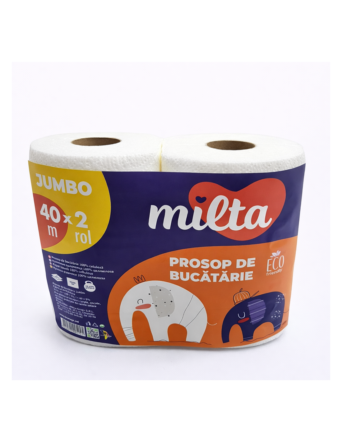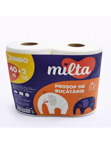 Prosoapele de hârtie Milta JUMBO, disponibile în pachete de 2 role, a câte 40 de metri, sunt concepute pentru o utilizare zilnică convenabilă și economică. Aceste prosoape sunt foarte absorbante, moi și durabile și rezistă la rupere și uzură atunci când sunt ude. Lungimea crescută a hârtiei permite schimbări mai puțin frecvente ale rolei, ceea ce le face o alegere practică pentru bucătărie și casă.