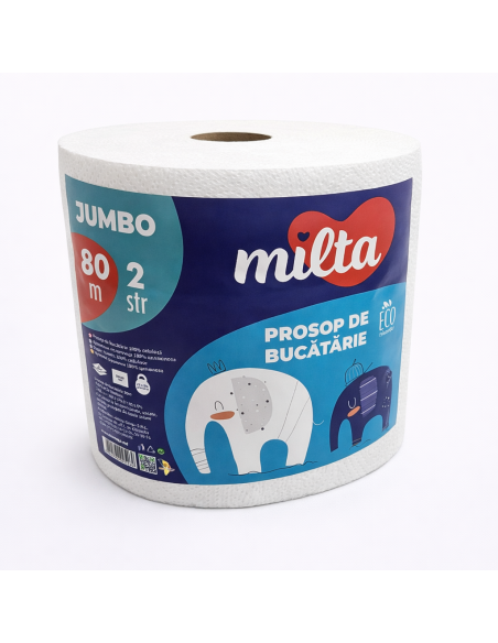 Prosoapele de hârtie Milta JUMBO 80m sunt fabricate din materiale 100% naturale și sunt potrivite pentru utilizarea zilnică acasă, în bucătărie și în aer liber. Aceste prosoape sunt durabile și moi, absorb bine umezeala și rezistă la rupere și uzură atunci când sunt umede. Formatul de 80m este conceput pentru utilizare intensă, permițând schimbări mai puțin frecvente ale rolei și este ideal pentru familiile cu o bucătărie aglomerată. Prosoapele de hârtie Milta reprezintă o soluție practică pentru menținerea curățeniei și igienei.
