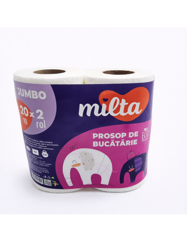 Prosoapele de hârtie Milta JUMBO ambalate în 2 role de 20 de metri, reprezintă o soluție practică pentru utilizarea zilnică în casă și bucătărie. Aceste prosoape sunt foarte absorbante, moi și durabile, rezistând la rupere și uzură. Dimensiunea lor compactă le face ușor de depozitat și economice de utilizat.