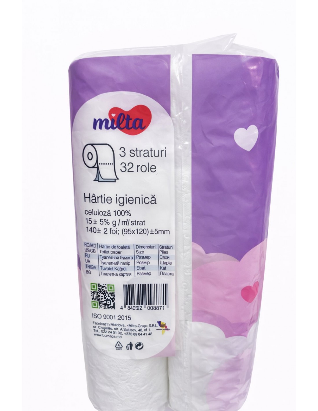 Бумага гигиеническая 3-сл Milta 32 рул/уп, целлюлоза, цвет белый